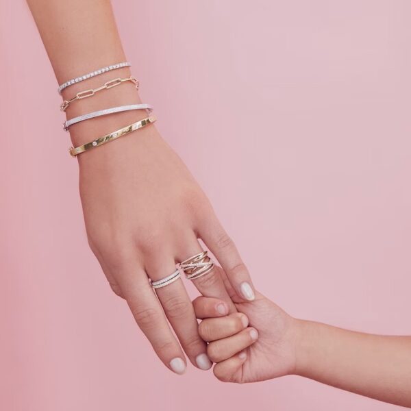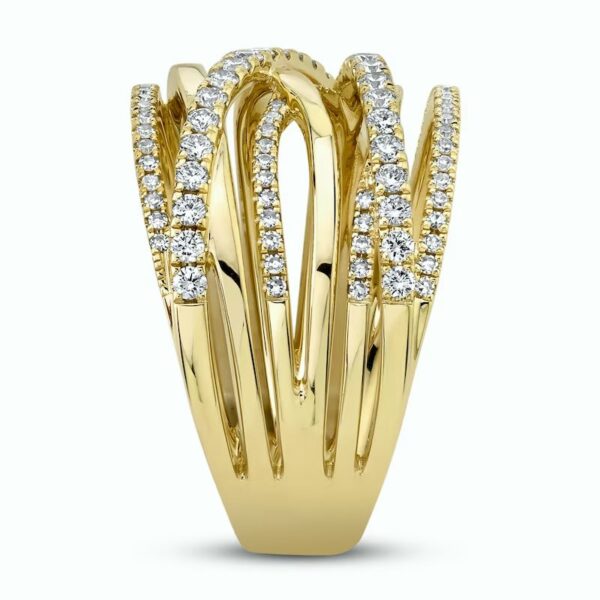 Brilliant round diamonds line multiple stacked and interwoven bands in this stunning, fashion-forward women’s ring from the collection. Fashioned in 14K yellow gold the total diamond weight of the ring is 5/8 carat.